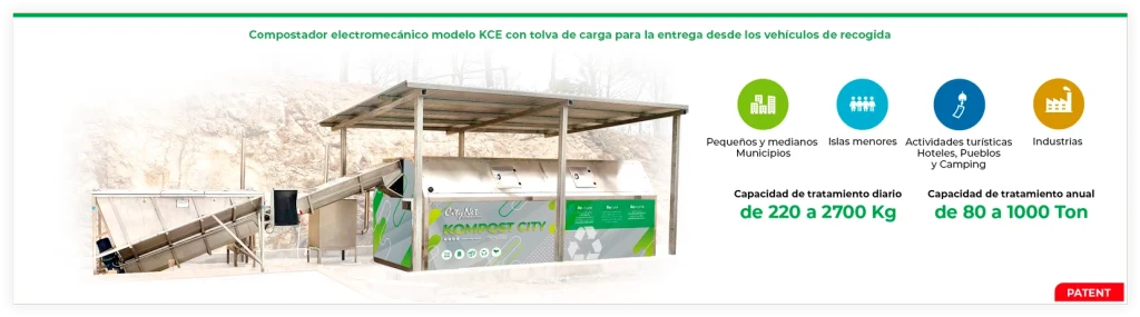 Los compostadores modelo KCE nacen de un proyecto que tiene como objetivo crear una máquina capaz de transformar la matriz orgánica doméstica y no doméstica en un excelente compost, a través de un proceso aeróbico absolutamente biológico, de una manera extremadamente simple de usar y administrar. Esto ha significado que todos los modelos de compostadores modelo KCE son completamente automatizado, no requiriendo intervención del operador más que la carga de la fracción orgánica y el agente estructurante.