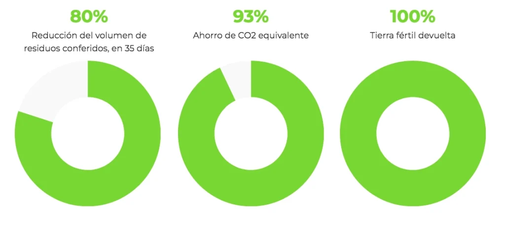 El impacto ambiental concreto es que se reduce 93,2 kg de CO2 por tonelada de residuos orgánicos tratados.